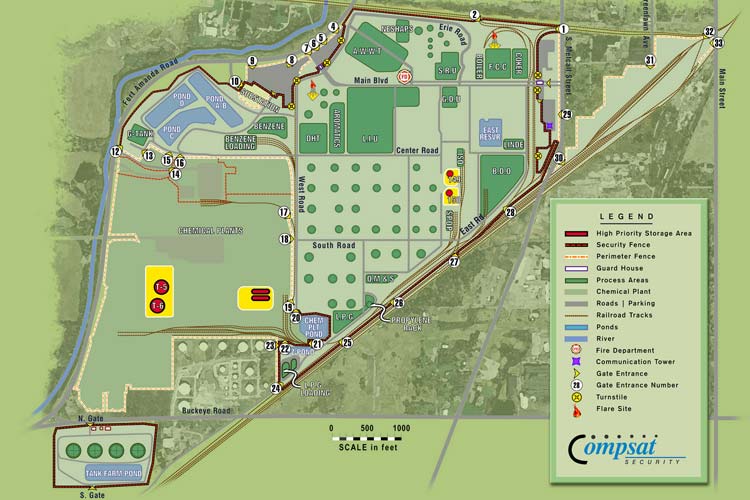 Campus map that details buildings and structures of oil refinery.